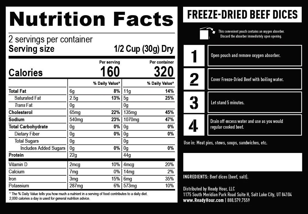 Ready Hour Freeze Dried Beef is the perfect compliment to any dish. Add it to soups, make sandwiches with it, or just eat it on its own for some added protein. The possibilities are endless. Ready Hour’s freeze-dried process locks in vitamins and minerals and tastes like the day it was made.