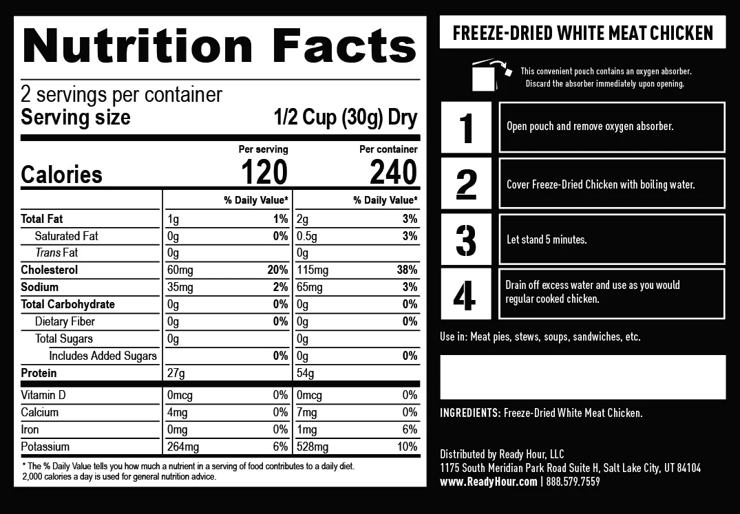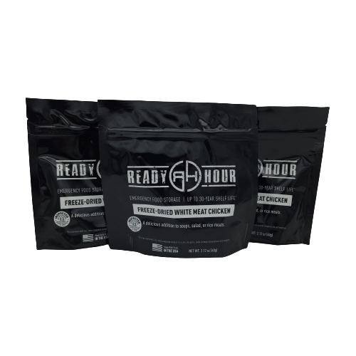 Each fat-free serving provides you with 27 grams of protein. Our chicken breast complements pasta, soups, stews and rice with rich flavor. Ready Hour case packs allow you to buy in large quantities, without wasting what you don’t use right away. These cases come with six pouches of freeze-dried chicken. This helps you maintain the shelf-life of your chicken until you’re ready to cook it.