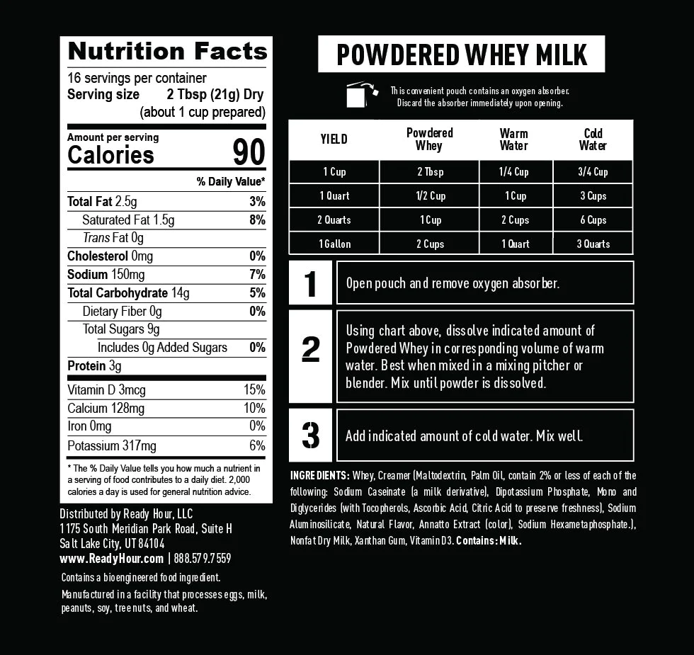 Long Lasting – Ready Hour Powdered Whey Milk lasts up to 25 years unopened, and one year once you open the can. Store it in a cool, dry location where temperatures stay between 55 and 70 degrees for optimal longevity.