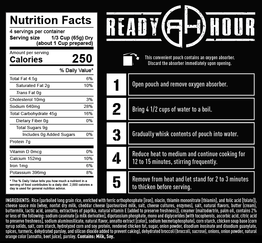 Ready Hour’s Cheesy Broccoli Soup gives you the makings of a hot lunch or dinner that your whole family will love anytime. Much easier and more affordable than going out for pizza or burgers, their Cheesy Broccoli and Rice Soup speaks to that natural urge for nutritious, delicious sustenance.
