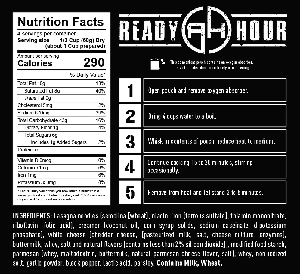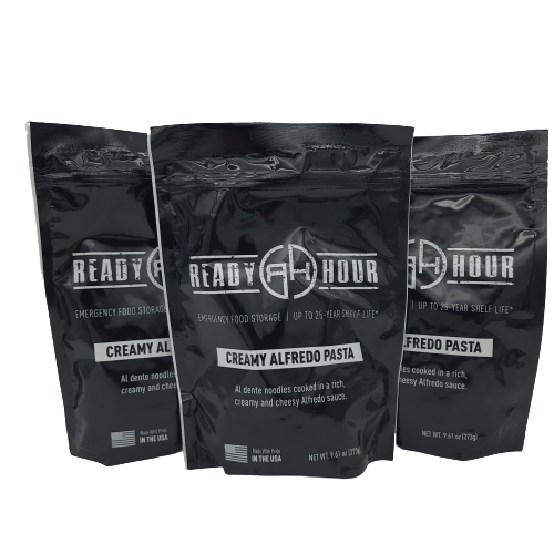 Ready Hour has the advantage when it comes to their brand of foods. All of their food requires no refrigeration as Creamy Alfredo Pasta normally would. Rich, creamy Alfredo with al dente noodles makes a great main dish or side dish in your next meal. Takes no time at all to prepare and tastes like homemade. You won’t believe how great this tastes!