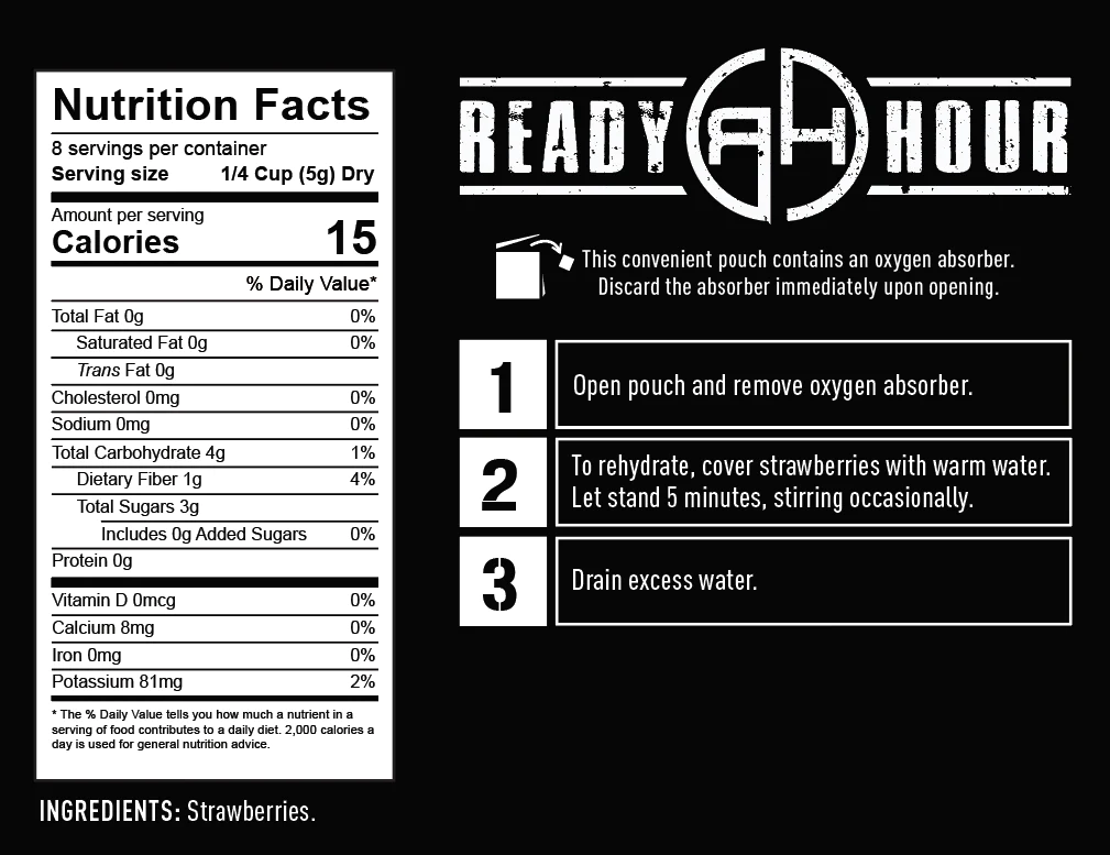 Ready Hour Strawberries requires no refrigeration, and last up to 30 years unopened, and one year once you open the pouch. Store it in a cool, dry location where temperatures stay between 55 and 75 degrees for optimal longevity.